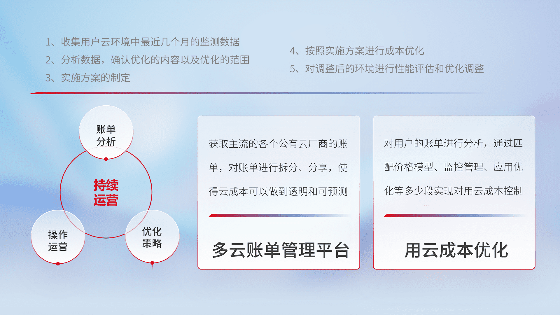 通过多云纳管,,以统一的资源数据模型把客户的云资源进行抽象和封装,,,,进而实现对多云资源的统一操作,,,,保障云资源管理的可靠性、、稳定性与可用性。。。。量身定制化运维内容,,,配置、、开发运维、、、补丁管理、、、备份、、、监控、、认证和访问管理、、、审计和日常巡检等,,,保障在用云过程中的可靠度,,,稳定度以及高可用率。。。。