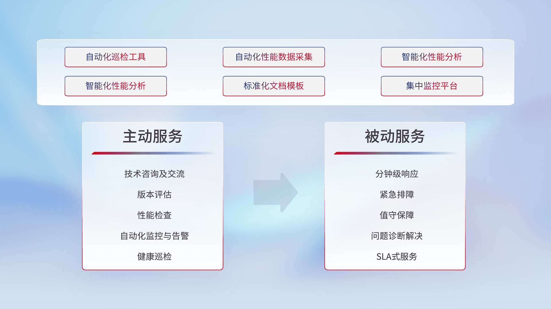 智能化工具和标准化文档,,,,保障服务质量,,,,提供主动服务(包含技术咨询、、版本评估、、性能检查、、、自动化监控与告警、、、、健康巡检)和被动服务包含(分钟级响应、、、紧急排障、、、、值守保障、、问题诊断解决、、SLA服务)。。。。